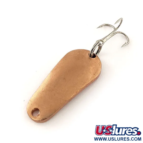 De naam "Aero" en de gewichtsmarkering van 1/4 oz (7 g) zijn direct in het concave metalen oppervlak gestempeld en kenmerken deze vintage Amerikaanse lepel. Het lichaam meet 1 1/2" (3,7 cm) en heeft een rijke koperen afwerking die helder en duidelijk blijft, wat een conditiescore van 5/5 weerspiegelt. Geproduceerd door de Aeroplane Spinner Co. in de VS, is het kunstaas gebouwd met een stevige zilverkleurige dreg die met een splitring aan de achterzijde is bevestigd. Een enkel, nauwkeurig geponst gat aan het smalle uiteinde maakt directe lijnbevestiging of het toevoegen van een onderlijn mogelijk. Geïdentificeerd door productcode 12052, is de solide constructie van de lepel afgestemd op traditionele werp- of troltechnieken.