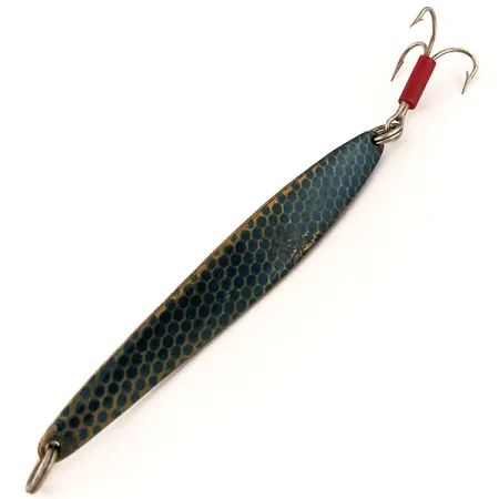 Een gewicht van 31 g (1 oz) zorgt voor de nodige dichtheid om diepe structuren te bereiken of de wind te doorklieven tijdens een verre worp. Deze Johnson Lujon, gecatalogiseerd onder productcode 13032, toont een opvallend blauw honingraatpatroon dat visuele textuur toevoegt aan de 9 cm (3 1/2") body. De metalen afwerking is uitzonderlijk goed bewaard gebleven en het item heeft een conditiescore van 5/5, klaar voor een vitrinekast of een kunstaasrol. Een rode plastic huls aan de basis van de dreg dient als een klassieke visuele attractor en aanvalspunt voor vis. Het langgerekte profiel en de lichte kiel op de buik zijn kenmerkend voor Amerikaanse metalen kunstaas uit het midden van de vorige eeuw, bedoeld voor jigging of werpen. Beide uiteinden zijn voorzien van robuuste splitringen, wat zorgt voor een veilige verbinding met je onderlijn en de hardware. Geproduceerd in de VS, weerspiegelt dit exemplaar de duurzame constructietechnieken die Johnson tot een gevestigde naam maakten in verticaal jigging-materiaal.