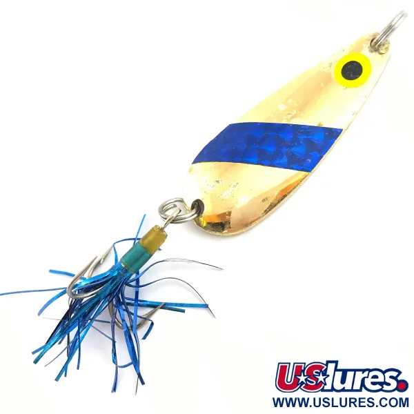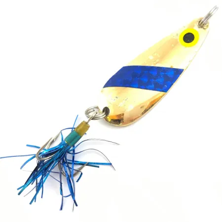 Met een gewicht van 10g (1/3oz) heeft deze Lindy Finsel lepel een klassieke vergulde afwerking met een opvallende blauwe holografische streep. Met een lengte van 5,5cm (2 1/4") is het druppelvormige lichaam een kenmerk van de Lindy / Little Joe productietraditie. Dit specifieke exemplaar, herkenbaar aan productcode 4530, heeft een geschilderd geel oog met een zwarte pupil nabij de bovenste splitring. De afwerking bestaat uit een scherpe dreg versierd met blauwe tinsel-flash, op zijn plaats gehouden door een tweekleurige turquoise en goudkleurige kraag. Vervaardigd in de USA, weerspiegelt de metalen body de hoogwaardige platingtechnieken die Lindy-Little Joe in die tijd gebruikte. De staat is gewaardeerd op 4/5, met een schoon en goed bewaard oppervlak dat de originele glans op zowel het metaal als de decoratieve tape behoudt. Aan de holle binnenzijde van het kunstaas bevindt zich een ingestampt merkteken, wat de authenticiteit voor verzamelaars garandeert.