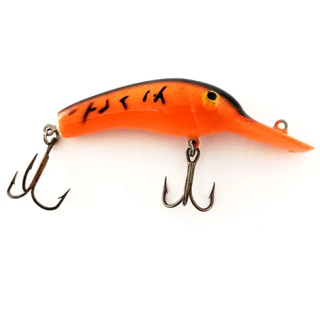 Deze vintage Lindy Shadling UV in het levendige Orange Tiger patroon weegt 3/16oz (5,5g). Het is een authentiek stukje Amerikaanse hengelsportgeschiedenis uit de jaren 80, geproduceerd door de firma Lindy / Little Joe in de VS. Met een lengte van 2" (5cm) imiteert het profiel een kleine shad of witvis, voorzien van een kenmerkende gewelfde rug en een prominente duiklip. Dit specifieke exemplaar, herkenbaar aan productcode 11885, is behandeld met een gespecialiseerde UV-afwerking voor een betere zichtbaarheid in troebel water of bij weinig licht. De hardware bestaat uit twee dreggen op de buik en staart. De lak is nog haarscherp, waarbij de zwarte tijgerstrepen een scherp contrast vormen met de fluorescerende oranje basis. De algehele staat is uitzonderlijk schoon, met een conditiescore van 5/5. Een donkere, smalle streep loopt langs de rugzijde en eindigt bij de realistisch geplaatste ogen op de kop.