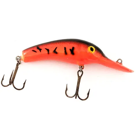 Een diepduikend oranje en zwart lichaam kenmerkt deze vintage Lindy Shadling UV, een uniek reliek uit de Lindy / Little Joe line-up. Met een lengte van 5 cm (2") heeft het kunstaas een opvallend kleurverloop van zwart naar oranje op de rug en zijkanten, geaccentueerd door donkere verticale strepen die doen denken aan een kreeft- of tijgerpatroon. De oversized duiklip is naadloos in de kop geïntegreerd en bevat het voorste bevestigingsoog voor de lijn, ontworpen om dieper water te bereiken. Dit specifieke exemplaar, gecatalogiseerd onder productcode 12984, weegt 7 g (1/4 oz) en stamt uit het Amerikaanse productietijdperk van de jaren 80. De geel geschilderde ogen vormen een scherp contrast met het donkere profiel van de kop. Wat de conditie betreft, scoort het een 5/5; hoewel het in uitstekende staat verkeert, onthult een nadere blik kleine oppervlakkige krasjes op de duiklip en de bovenkant van de kop door opslag. De hardware bestaat uit twee originele dreggen met een bronzen afwerking. Dit kunstaas is specifiek ontworpen met UV-reactieve eigenschappen voor betere zichtbaarheid bij weinig licht of in diepere waterlagen.