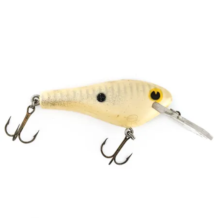 Met een gewicht van 16 g (3/5 oz) bezit deze handgemaakte cederhouten crankbait de degelijke uitstraling die van Poe's een vaste waarde maakte in de competitieve visserij op baars. De Super Cedar RC-3, met productcode 22032, is voorzien van een body van 7 cm (2 3/4") gedraaid uit cederhout, een materiaal geselecteerd op basis van dichtheid en drijfvermogen tijdens het werpen. Dit specifieke exemplaar is afgewerkt in een klassiek cream shad patroon, geaccentueerd door een prominente zwarte stip op de flank en gele ogen met donkere pupillen. Aan de voorzijde is een brede, transparante plastic duiklip bevestigd, ontworpen om het kunstaas tijdens een constante inhaalslag op diepte te brengen. De hardware bestaat uit twee originele buik- en staartdreggen, die lichte ouderdomssporen vertonen die zijn historie weerspiegelen. Gemaakt in de VS; de body behoudt een verzorgd uiterlijk en krijgt een conditiescore van 4/5 vanwege wat licht gebruik aan de waterkant.