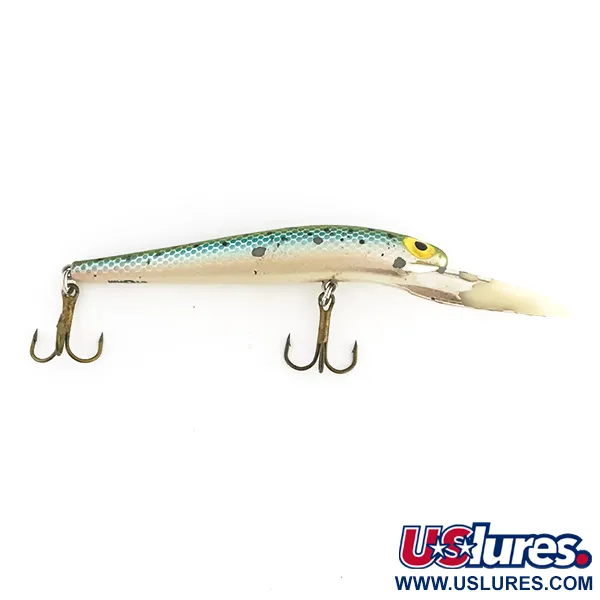 Een realistische forel-afwerking bedekt het slanke lichaam van deze vintage plug, gefabriceerd door Storm onder productcode 8556. Met een gewicht van 8,8 g (1/3 oz) en een lengte van 9 cm (3 1/2"), is dit exemplaar voorzien van de kenmerkende dieplopende duiklip die ontworpen is om dieptes tussen 2 en 4 meter (6,5–13 ft) te bereiken. Het STORM-logo is nog scherp zichtbaar op de zijkant van de staart, wat de Amerikaanse herkomst bevestigt. Voornamelijk gebruikt voor trollen of werpen op snoekbaars; het drijvende ontwerp biedt specifieke voordelen in verschillende waterlagen. De conditie is 4/5, met lichte gebruikssporen op de extra grote duiklip en langs de lak van het lichaam, wat passend is voor een vintage stuk gereedschap van deze leeftijd. Het originele beslag vertoont wat ouderdomssporen maar is structureel nog in goede staat.