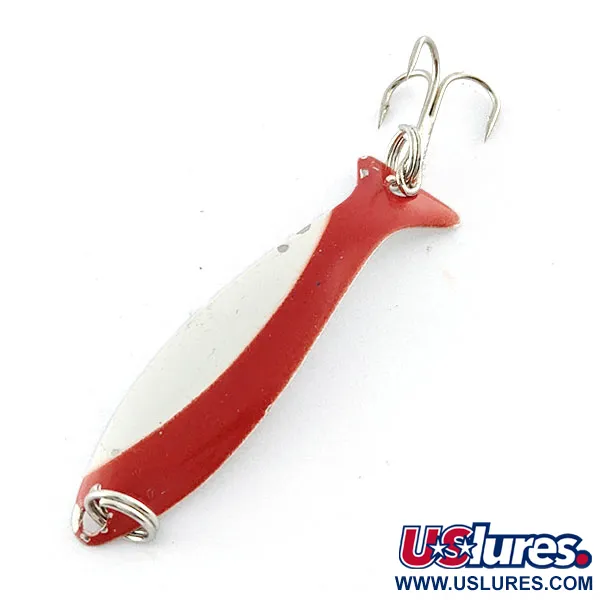 Rode en witte lak bedekt diagonaal de bovenzijde van deze kleine, visvormige lepel, een kleurenpatroon dat historisch bewezen is voor een uitstekende zichtbaarheid. Met een gewicht van slechts 3/64oz (1,5 g) en een lengte van 1 1/2" (4 cm) vertegenwoordigt de Worth Fly Rod Demon een klassiek tijdperk van Amerikaans ultra-light hengelsportontwerp. Dit in de VS vervaardigde exemplaar draagt productcode 17082 en verkeert in een 5/5 conditie, waarbij geen sporen van ouderdom te zien zijn op de levendige afwerking of de gepolijste zilveren achterzijde. De montage omvat twee stevige splitringen en een enkele dreg, wat de kwaliteitsconstructie weerspiegelt die synoniem staat voor het merk Worth. Subtiele grijze stippen bij de voorkant bootsen ogen na op het slanke profiel, ter afronding van een ontwerp dat bedoeld is voor het subtiele werpen met de vliegenhengel.