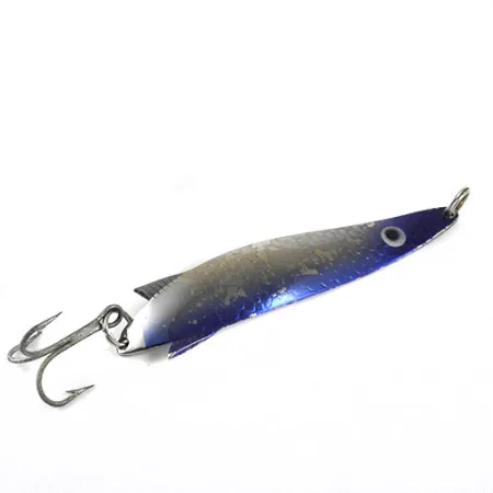 Met een gewicht van precies 18g (2/3oz) heeft deze in Zweden gemaakte lepel een kenmerkende Nikkel / Blauwe afwerking die verzamelaars onmiddellijk zullen herkennen. Het 9cm (3 1/2") lange lichaam van deze Abu Toby, herkenbaar aan productcode 0961, vertoont een diepblauwe tint langs de buitenranden, die een getextureerd zilveren midden omlijst dat de schubben van een aasvis nabootst. Een enkel zwart-wit oog is geplaatst bij de kop, terwijl de onderkant een strakke, vernikkelde afwerking heeft, gestempeld met het Abu Garcia-keurmerk en de herkomst uit Zweden. Dit specifieke exemplaar is voorzien van de kenmerkende kleine vinnen bij de staart en is uitgerust met een stevige dreg die met een splitring is bevestigd. Over het algemeen verkeert het kunstaas in een 4/5 conditie, met zeer lichte ouderdomssporen en behoud van een levendige glans.