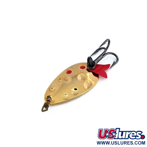 Met een gewicht van 5 g (3/16 oz) heeft deze vintage lepel een klassieke gehamerde afwerking op zijn druppelvormige body. Het gedempte gouden oppervlak is voorzien van drie duidelijke rode stippen bij de kop, een kenmerk van de Acme Fish Hawk-serie. Met productcode 9923 is dit zeldzame exemplaar niet langer in productie, wat het een belangrijke vondst maakt voor verzamelaars van Amerikaans hengelsportmateriaal. Het kunstaas is uitgerust met een donker afgewerkte dreg en een kenmerkende rode plastic trailer. De achterkant van de 3 cm (1 1/4") lange lepel is gepolijst tot een gladde, reflecterende glans. Een conditiescore van 5/5 weerspiegelt de uitzonderlijke staat van de metalen oppervlakken en de originele hardware. Een kleine messingkleurige driehoekige splitring aan de kop zorgt voor een stevig bevestigingspunt.