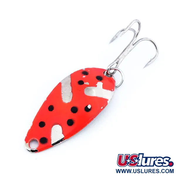 Fluorescerende rode verf domineert het oppervlak van deze 3 cm (1 1/4") lepel, die is voorzien van een opvallend patroon van zwarte stippen op een nikkelen basis. Deze 3,5 g (1/8 oz) Acme Little Cleo, met productcode 10721, is afgewerkt met een UV-reactieve coating die intens oplicht in troebel water of onder ultraviolet licht. Delen van de glanzende vernikkeling zijn zichtbaar gelaten door de verf heen om een hoog visueel contrast te creëren. De montage bestaat uit een stevige splitring en een zilverkleurige dreg. In de huidige 5/5 conditie ziet het kunstaas er uitzonderlijk goed onderhouden uit, met behoud van de verf en de metaalglans. Deze in de VS gemaakte klassieker maakt gebruik van zijn unieke gebogen vorm om zijn specifieke actie te bereiken tijdens het werpen of trollen.