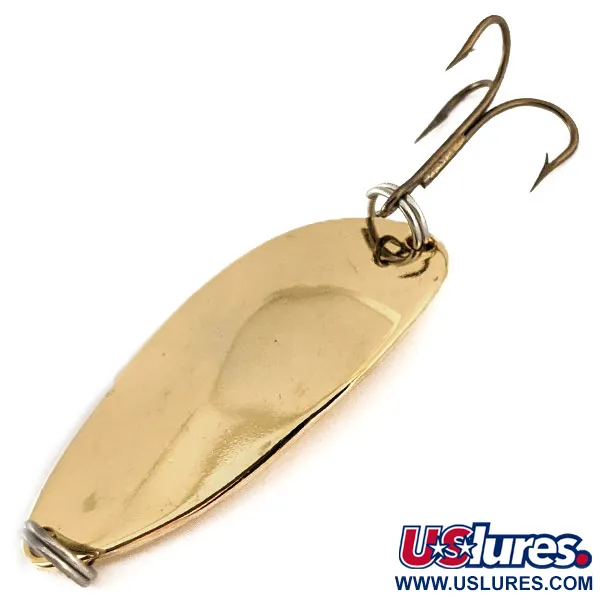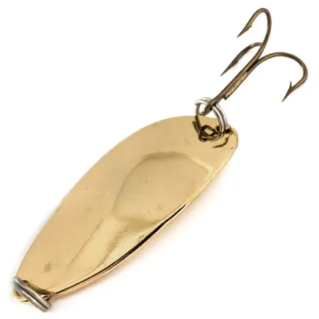 Op de achterkant is duidelijk het gewicht van 2/3 oz (18g) gestempeld, een klassieke specificatie voor dit iconische Acme-ontwerp. De gepolijste gouden afwerking reflecteert het licht briljant, een kenmerk van de Little Cleo-serie bedoeld voor hoge zichtbaarheid in verschillende wateromstandigheden. Met een lengte van 2 1/4" (5,5 cm) is dit exemplaar verzwaard voor diepwatertrollen of verre worpen. Robuuste splitringen aan beide uiteinden borgen de lijnbevestiging en de dreg. Dit originele, in de USA gemaakte kunstaas met productcode 11252 toont de kenmerkende gebochelde vorm die het profiel van het merk al decennia definieert. Het oppervlak is in uitstekende staat, met een 5/5 waardering voor de schone, reflecterende goudlaag.