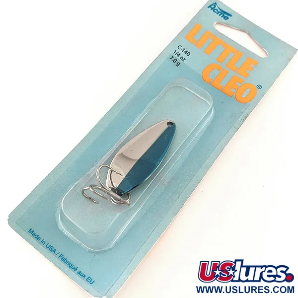 Deze in de VS gemaakte lepel is 4 cm (1 1/2") lang en heeft een gebogen metalen body met een traditioneel tweekleurig ontwerp voor een hoog visueel contrast. De afwerking is helder Nikkel / Blauw, aangebracht op de kenmerkende gewelfde vorm van de Acme Little Cleo-serie. Gecatalogiseerd onder productcode 11346 (fabrikantstijl C-140/NNB), bevindt het kunstaas zich nog in de originele blisterverpakking. Dit exemplaar verkeert in conditie 6, wat betekent dat het ongebruikt is en de fabrieksmantel op zowel de plating als de dreg heeft behouden. Met een gewicht van 7 g (1/4 oz) is de lepel ontworpen voor werpprecisie en voorzien van het klassieke gestempelde logo op de kop. De achterkant van de verpakking bevat tweetalige tekst die de historische populariteit onder Noord-Amerikaanse sportvissers gedurende meer dan vijftig jaar weerspiegelt.