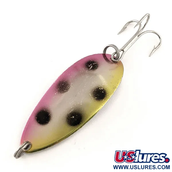 De stempeling op de achterkant van deze 11g (2/5oz) lepel identificeert hem duidelijk als een echte, in de USA gemaakte klassieker. De 'Rainbow Trout' afwerking is zorgvuldig aangebracht, met een zacht verloop van een roze bovenrand naar een heldergeel onderste gedeelte, met een reflecterende zilverwitte kern geaccentueerd door zes dikke zwarte stippen. Met een lengte van 5,5cm (2 1/4") is dit exemplaar in onberispelijke staat en verdient het een conditiescore van 5/5. Het zware metalen lichaam is gekoppeld aan duurzame roestvrijstalen splitringen en een sterke dreg, waardoor het een robuuste keuze is voor werpen of trollen. De Acme Little Cleo, bekend onder productcode 11688, is geliefd bij verzamelaars vanwege de kenmerkende gestempelde 'Little Cleo' branding en gewichtsaanduiding op de gepolijste zilveren achterzijde.
