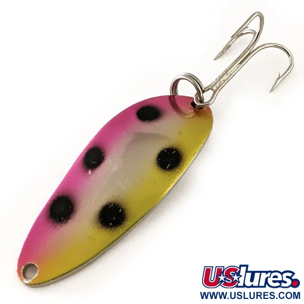 Gestempeld met de aanduiding "WIGL LURE" op de achterzijde, vertegenwoordigt deze 9 g (1/3 oz) Acme Little Cleo lepel een klassiek tijdperk van Amerikaanse hengelsportfabricage. De voorzijde is voorzien van een levendig Rainbow Trout patroon, waarbij een felle roze rand overgaat in een wit midden en een geelgouden buik, geaccentueerd door zes nauwkeurig geplaatste zwarte stippen. Met een lengte van 4,5 cm (1 3/4") is het kenmerkende gebogen profiel van de lepel ontworpen voor stabiliteit tijdens het werpen en trollen. Dit specifieke exemplaar, geïdentificeerd door productcode 11689, verkeert in 5/5 conditie, met een schone, reflecterende chromen achterzijde en onberispelijk lakwerk. De originele hardware, inclusief de bovenste splitring en de dreg, is intact en glanzend. De "LITTLE CLEO" stempel is diep en leesbaar, wat de authentieke herkomst van deze middelgrote lepel onderstreept.