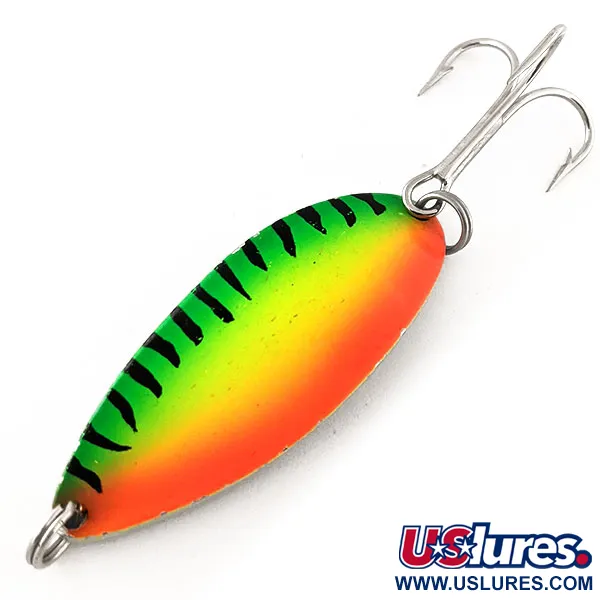Duidelijk ingeslagen in de gepolijste zilveren achterzijde bevestigen de markeringen "LITTLE CLEO" en "3/4 OZ." (21 g) de identiteit van deze klassieker van Amerikaanse makelij. Met een lengte van 6,5 cm (2 1/2") is dit exemplaar voorzien van een levendige Fire Tiger-afwerking, gekenmerkt door krachtige zwarte strepen over een verloop van groen naar geel naar oranje. De dikke metalen constructie en de kenmerkende gebogen vorm zijn handelsmerken van het ontwerp van de Acme Tackle Company, waardoor het kunstaas zijn positie in de waterkolom behoudt tijdens een gestage inhaalbeweging. Dit specifieke exemplaar, geïdentificeerd door productcode 11849, verkeert in 5/5 conditie, met een schoon oppervlak en een scherpe dreg bevestigd via een robuuste splitring. De zware platering aan de binnenzijde zorgt voor een felle flits die contrasteert met de goed zichtbare geverfde buitenzijde. Ontworpen voor zowel werpen als trollen, vergemakkelijkt de gewichtsverdeling van deze lepel van 21 g (3/4 oz) verre worpen, zelfs bij tegenwind.