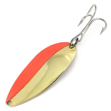 Duidelijk gestempeld op de goudkleurige achterkant, identificeert het 'WIGL LURE' merkteken deze Acme Little Cleo als een belangrijk overgangsstuk dat kort nadat Acme het merk overnam werd geproduceerd. Met een gewicht van 21 g (3/4 oz) en een afmeting van 6,5 cm (2 1/2"), heeft deze massief metalen lepel een contrastrijke afwerking met levendige oranje verf die de helft van het gepolijste vergulde oppervlak bedekt. Dit specifieke exemplaar, aangeduid met productcode 7789, is een in de USA gemaakte klassieker die dient als brug tussen het originele Wigl Lure erfgoed en de fabricagegeschiedenis van Acme. De afwerking blijft uitzonderlijk helder en het beslag — inclusief de grote dreg en splitring — vertoont geen tekenen van slijtage, waardoor het kwalificeert als een ongebruikt 5/5 exemplaar voor de database van een verzamelaar. Het stempel op de holle zijde bevat ook het gewicht en de naam 'LITTLE CLEO', waardoor de kenmerkende markeringen van deze vroege productieserie behouden zijn gebleven. Deze oranje en gouden combinatie is specifiek ontworpen voor zichtbaarheid bij het werpen of trollen in verschillende wateromstandigheden.