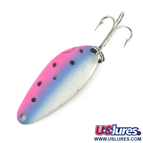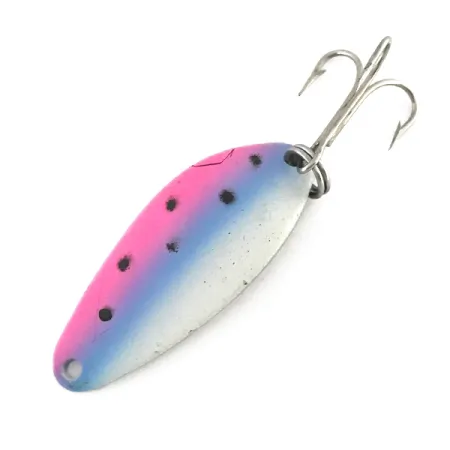 Op de achterzijde is het gewicht van 1/4oz (7g) samen met de merkstempel duidelijk in het gepolijste nikkel geslagen. Aan de voorzijde zorgt het Trout-kleurschema voor een hoge zichtbaarheid dankzij drie verticale banen in roze, blauw en wit, gedetailleerd met zes zwarte stippen. Met een lengte van precies 1 1/2" (4cm) is de zware metalen body ontworpen voor het werpen of trollen op diverse roofvissen. Het beslag bestaat uit een sterke splitring en een scherpe dreg, beide zonder tekenen van ouderdom. Geregistreerd onder productcode 8289, is deze Acme Little Cleo een klassiek voorbeeld van Amerikaans kunstaas. Dit exemplaar krijgt een score van 5/5 voor de staat, aangezien de lak strak blijft en de vernikkelde achterkant zijn spiegelende glans behoudt.