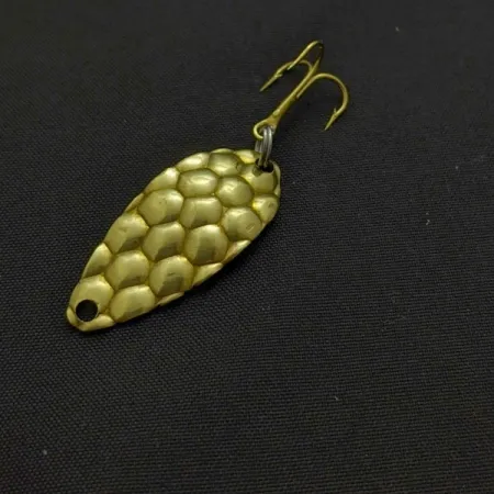 Het getextureerde bellenpatroon op de bolle kant van deze 1 1/4" (3 cm) gouden lepel levert een opvallende visuele handtekening voor lichte werpvisserij. Met een gewicht van 1/8 oz (3,5 g) beschikt deze Acme Little Cleo over een gestempelde schubbenafwerking die ontworpen is om licht te vangen en te reflecteren. De onderkant van de lepel is glad, met de naam van de fabrikant in het metaal gestempeld. Productcode 24586, conditie 5/5. Een goudkleurige dreg is aan de achterzijde gemonteerd, passend bij het metallic uiterlijk van de body.