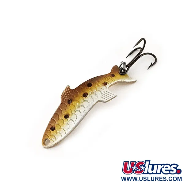 Met een gewicht van 1/8oz (4g) en een lengte van 1 1/2" (4cm) is dit exemplaar een typisch voorbeeld van de Amerikaanse hengelsportgeschiedenis. Het kenmerkende silhouet van de Acme Phoebe heeft een gebogen, driedimensionaal visprofiel, uitgevoerd in een gedetailleerd Brown Trout / Gold patroon dat de stippen en schubtexturen van kleine aasvisjes nabootst. Op de achterkant is de messingkleurige metalen body duidelijk voorzien van de naam van de fabrikant, met een schoon en helder oppervlak. Dit specifieke lepeltje, gecatalogiseerd onder productcode 11454, verkeert in ongebruikte staat (score 6/5) en vertoont geen sporen van watergebruik of oxidatie van het materiaal. Het is uitgerust met een scherpe dreg die via een robuuste splitring aan de staart is bevestigd. Het unieke hydrodynamische ontwerp is ontwikkeld voor veelzijdigheid, waardoor het effectief kan worden gevist in zowel ondiepe stukken als diepere kolken. De aantrekkingskracht berust op de natuurlijke schittering van het metaal en de diepte van de geverfde patronen om roofvissen te triggeren onder verschillende lichtomstandigheden.