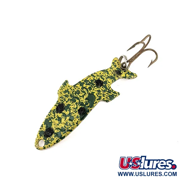 Een opvallend 'Frog' patroon bestaande uit groene en gele spetters met gedurfde zwarte vlekken bedekt het gebogen metalen lichaam van dit exemplaar. Met een gewicht van 1/8oz (4g) en een lengte van 1 1/2" (4cm), beschikt de lepel over het karakteristieke anatomische silhouet dat de Acme Phoebe al decennia lang een favoriet maakt in menig tacklebox. Dit specifieke item, herkenbaar aan productcode 11506, is ongebruikt en behoudt zijn originele afwerking. Op de schone, zilverkleurige achterkant is de naam 'PHOEBE' duidelijk in het midden van het metaal gestempeld. De montage bestaat uit een scherpe, bronskleurige dreg die met een betrouwbare splitring aan de staart is bevestigd. Dankzij het driedimensionale gestempelde ontwerp vertoont het een realistisch aasvisprofiel vanuit meerdere hoeken bij het werpen of trollen.