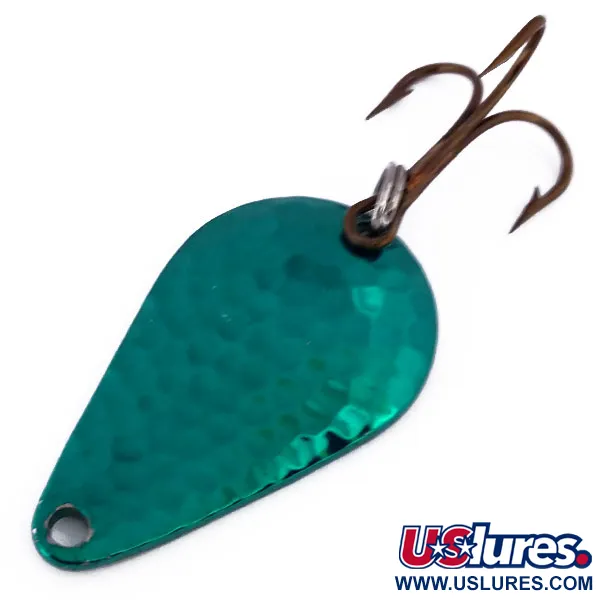 Een gehamerde groene afwerking vangt het licht op de voorzijde van deze 14 g (1/2 oz) lepel, wat zorgt voor een gestructureerd oppervlak dat contrasteert met de gladde nikkelen achterkant. Deze Acme Stee-Lee, geregistreerd onder productcode 10368, is 4,5 cm (1 3/4") lang en heeft het klassieke druppelvormige profiel dat kenmerkend is voor vintage Amerikaanse tackle-collecties. De achterkant van het kunstaas is duidelijk gestempeld met het merk van de fabrikant, wat de Amerikaanse herkomst bevestigt. Een scherpe dreg is aan de achterzijde bevestigd via een robuuste splitring, en het exemplaar verkeert in ongebruikte staat met een score van 6. Het zware metaal is gebouwd voor verre worpen und helpt de lepel om diepte te bereiken tijdens het binnenvissen. Er is geen slijtage zichtbaar op de levendige groene zijde of de nikkelen laag.