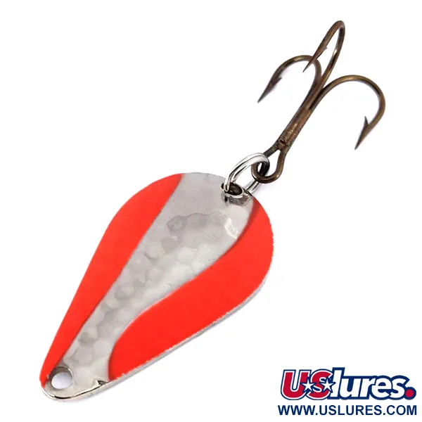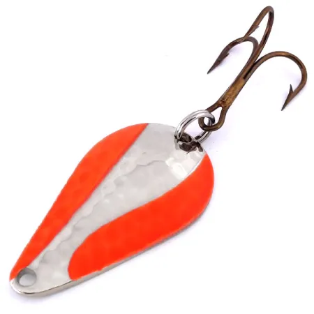 Een vernikkeld lichaam gecombineerd met fluorescerende oranje strepen definieert het visuele profiel van deze 4,5 cm (1 3/4") Acme Stee-Lee UV. Met een gewicht van 14 g (1/2 oz) heeft de lepel een subtiele gehamerde textuur over het metalen oppervlak, die samenwerkt met het hoogwaardige pigment. Onder ultraviolet licht veranderen de oranje banden in een lichtgevende roodoranje gloed, een technische eigenschap die wordt gebruikt voor zichtbaarheid in diep water of bij weinig licht. Dit exemplaar, met productcode 10371, is ongebruikt met een conditiescore van 6. De montage bestaat uit een bronzen dreg bevestigd via een splitring, wat de robuuste constructienormen van de fabrikant weerspiegelt. Een lijnoog is netjes geponst aan het smalle uiteinde van het druppelvormige blad voor diverse speld- of knoopconfiguraties.