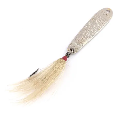 Deze vintage lepel, voorzien van een opvallende gehamerde nikkelafwerking, toont het klassieke vakmanschap dat geassocieerd wordt met Amerikaans kunstaas van Acme. Met een lengte van 9 cm (3 1/2") en een gewicht van 60 g (2 oz) heeft de Acme Trophy (productcode: 9863) een aanzienlijke gewicht-tot-grootte verhouding, ontworpen voor diep verticaal jiggen of lange afstandsworpen. De stempels "TROPHY" en "ACME" zijn duidelijk zichtbaar op het bovenste en onderste deel van het metalen lichaam, wat zijn status bevestigt als een betrouwbaar alternatief voor de iconische Hopkins lepels. Een enkele geveerde haak is bevestigd via een stevige splitring, voorzien van natuurlijk gekleurd haar dat is vastgezet met een zichtbare rode draadwikkeling. De gehamerde textuur op het oppervlak zorgt voor een multidirectionele schittering wanneer het licht de nikkelen plating raakt. Op een schaal van 5 verdient dit exemplaar een solide 4/5, met lichte oppervlakkige sporen van opslag, maar met behoud van de structurele integriteit en een scherpe haakpunt. De bovenkant van de lepel bevat een voorgeboord oog voor directe bevestiging of de installatie van een splitring.