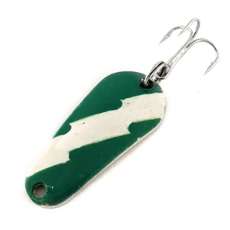Duidelijk gestanst op de gepolijste gouden achterkant staan de naam Aero en het gewicht, wat deze klassieke Amerikaanse lepel van de Aeroplane Spinner company identificeert. Met een lengte van 3,7 cm (1 1/2") heeft het kunstaas een opvallende emaille afwerking aan de bolle kant, waar een gekartelde witte streep een diepgroen veld doorsnijdt. Dit specifieke exemplaar, geïdentificeerd door productcode 11803, verkeert in uitstekende 5/5 staat met de originele verf nog scherp en levendig. Een scherpe zilveren dreg is aan de achterkant bevestigd via een stevige splitring, klaar voor het werpen of licht trollen. Het gewicht van 7 g (1/4 oz) biedt voldoende massa voor gerichte plaatsing in verschillende wateromstandigheden. Het koperkleurige metaal op de achterzijde dient als een contrastrijke flits tegen de geverfde bovenzijde.