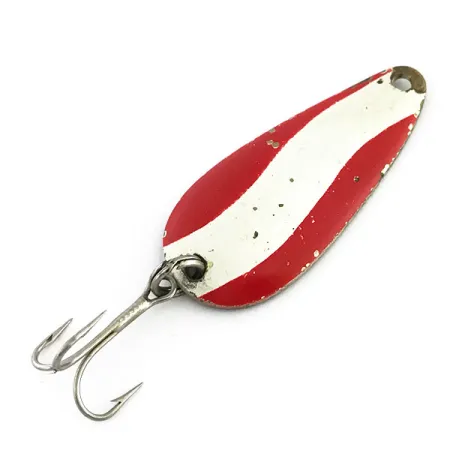 Met een gewicht van 1/4 oz (8 g) is deze Aeroplane Spinner lepel een 2" (5 cm) klassieker uit de Amerikaanse hengelsport. De voorzijde is versierd met een kenmerkend rood-wit gestreept patroon, met kleine beschadigingen en licht verfverlies langs de randen, passend bij een 4/5 conditiescore. Op de achterkant is het messing oppervlak voorzien van een duidelijke „Aero” stempel, die het specifieke model identificeert. Dit kunstaas, bekend onder productcode 9206, is voorzien van zijn originele dreg. Het messing is verkleurd naar een rijke, donkere tint, wat een scherp contrast vormt met het lakwerk op de andere kant. Kleine slijtageplekjes zijn zichtbaar op de witte strepen, wat erop wijst dat dit kunstaas de nodige uren in het water heeft gemaakt.