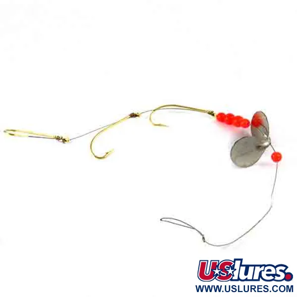 Goudkleurige haken gecombineerd met levendige rode kralen bepalen het visuele profiel van deze klassieke in de VS gemaakte montage. Met een totale lengte van 7 3/4" (20 cm) beschikt de set-up over een vernikkelde dubbele propeller spinner die duidelijk is gestempeld met "3 AERO SPIN" op het oppervlak. Met een licht gewicht van 1/8 oz (4 g) is de hardware gemonteerd op een flexibele staaldraad onderlijn, vaak gebruikt voor trollen of werpen. De Aeroplane Spinner company gebruikte een specifiek Aero spin 3 ontwerp met een reeks van zes felrode kralen om een visueel contrast te bieden tegen de metalen nikkelafwerking van de bladen. Met productcode 2992 verkeert dit exemplaar in indrukwekkende staat, beoordeeld met 5/5 vanwege de goed onderhouden oppervlakken en scherpe haakpunten. De goudkleurige haken zijn strategisch over de lijn verspreid om verschillende aastechnieken mogelijk te maken.