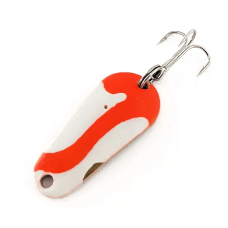 Een opvallende golf van fluorescerend oranje siert de voorzijde van deze Amerikaanse lepel, wat zorgt voor een hoge zichtbaarheid in troebel water. De Aeroplane Spinner Aero UV, gecatalogiseerd onder productcode 11537, is 4 cm (1 1/2") lang en weegt 7 g (1/4oz). Het kleurenpatroon bestaat uit een strakke witte basis met een gedurfde oranje streep, waardoor de originele vergulding zichtbaar blijft bij de onderste rand. Onder UV-licht reageert het oranje pigment intens, een specifieke technische eigenschap bedoeld voor presentaties in diep water of op bewolkte dagen wanneer de lichtinval minimaal is. Het kunstaas is uitgerust met een standaard dreg, bevestigd via een splitring aan de achterzijde. De verf heeft een scherpe, heldere rand en de metalen onderdelen zijn uitzonderlijk schoon, wat resulteert in een conditiescore van 5/5. Aeroplane Spinner heeft deze heavy-duty afwerkingen gebruikt om duurzaamheid te garanderen tijdens seizoenen van werpen en jiggen.