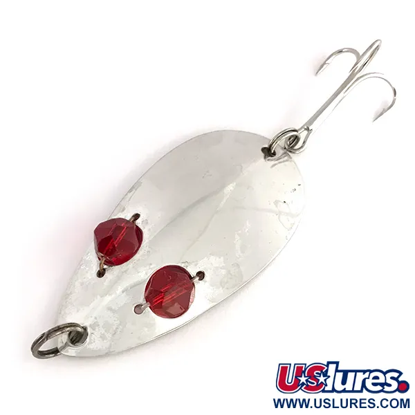Twee levendige rode gefacetteerde kralen zijn direct ingebed in de gehamerde nikkelen behuizing van deze in Canada gemaakte lepel, een kenmerk van de Allcock, Laight & Westwood-productietraditie. Met een gewicht van 21 g (3/4 oz) overspant het bladvormige ontwerp van het kunstaas 6,5 cm (2 1/2") en behoudt het een hoogglansafwerking. De concave zijde toont duidelijk de stempel "AL&W TORONTO" en het metaal vertoont geen tekenen van slijtage, consistent met een 5/5-conditiescore. Het kunstaas, geïdentificeerd met productcode 7903, is uitgerust met een scherpe dreg en dubbele splitringen voor stevige verbindingen. De gehamerde textuur over de nikkelen plating zorgt voor een klassieke esthetiek en dient om licht op te vangen en te reflecteren in het water tijdens het werpen of trollen.