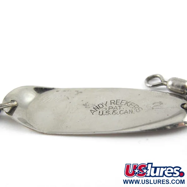 Duidelijk in het metalen oppervlak gestanst zijn het 'ANDY REEKERS'-merk en patentgegevens voor zowel de VS als Canada, wat de vintage Amerikaanse productiewortels benadrukt. Met een lengte van 1 1/2" (4 cm) heeft deze lepel een kenmerkende duo-metalen look met een gepolijste nikkelen buitenkant en een bronskleurige messing binnenkant. Met een gewicht van 3/32 oz (2,5 g) is het een specifiek hulpmiddel voor het trollen, ontworpen voor soorten die zich richten op kleiner aas. De montage voor productcode 1164 maakt gebruik van een enkele haak die is verbonden door een splitring en een geïntegreerde tonwartel om kinken in de lijn te voorkomen. In conditie 4/5 zijn de metalen oppervlakken schoon en goed bewaard gebleven, waardoor ze het licht effectief reflecteren met minimale ouderdomsverschijnselen. Het slanke profiel en de solide metalen constructie zijn karakteristiek voor dit specifieke in de VS gemaakte ontwerp voor het trollen.