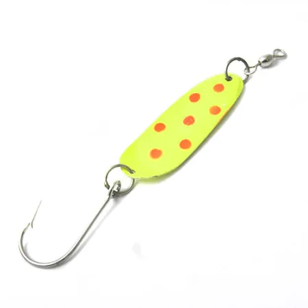 Gedetailleerd met rode cirkels tegen een levendige gele achtergrond, weerspiegelt de Andy Reekers 3 de kenmerkende visuele stijl van Amerikaanse troluitrusting uit het midden van de vorige eeuw. Dit exemplaar van 4,5 g (3/16 oz), herkenbaar aan productcode 0440, heeft een eenvoudig maar effectief profiel dat is ontworpen voor een stabiele actie in de waterkolom. De achterzijde is afgewerkt in effen geel met een zwart-geel mikpunt-oog bij de neus, wat een extra focuspunt vormt voor volgende vissen. Het is uitgerust met een enkele haak en een aan de voorzijde gemonteerde wartel, essentieel voor de stabiliteit en het voorkomen van het kinken van de lijn tijdens het trollen. Het exemplaar verkeert in 5/5 conditie en heeft de originele fabrieksafwerking op zowel de body als de onderdelen behouden.