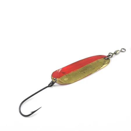 Op het messing lichaam van deze lepel van 4,5 g (3/16 oz) staan octrooidata die teruggaan tot de jaren 1920, met specifieke vermeldingen van 16 oktober 1923 en 2 februari 1926. Met een lengte van 5,0 cm (2") is de Andy Reekers 3 een typisch Amerikaans trolaas ontworpen voor een stabiele actie in de waterkolom. Hoewel de originele afwerking messing is, is er een rode streep aangebracht op één helft van het blad, een veelvoorkomende aanpassing door vissers voor een hoog contrast en betere zichtbaarheid. De staart van de lepel is duidelijk gemerkt met maat 3 vlak boven de splitring. Uitgerust met een enkele haak en een wartel aan de bovenzijde, vertoont het kunstaas zichtbare gebruikssporen uit zijn tijd in de tacklebox, wat een conditiescore van 3/5 oplevert. De constructie weerspiegelt de zware kwaliteit die typerend is voor Amerikaans vismateriaal uit het midden van de vorige eeuw, primair bedoeld voor het slepend vissen in zowel zoet als zout water.