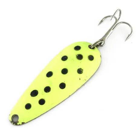 Op de bronzen achterkant van deze 9 g (1/3 oz) metalen lepel staan de klassieke Blue Fox-markeringen en de herkomst "USA" duidelijk ingestanst. Met een lengte van 5,5 cm (2 1/4") draagt deze Aqua Spoon de productcode 9525 en heeft hij een opvallende chartreuse voorkant met dertien zwarte stippen. Het exemplaar verkeert in 4/5 staat en vertoont lichte gebruikssporen door minimaal lakverlies aan de randen, hoewel het onderliggende metaal en de ingestanste letters scherp blijven. De constructie bevat een stevige dreg die is bevestigd met een splitring, waardoor het een betrouwbare keuze is voor werpen of trollen in verschillende lichtomstandigheden. Het contrast tussen het neon-gespoten oppervlak en de metalen koperen onderkant is een kenmerkend ontwerp uit het Amerikaanse productietijdperk van het merk. Een klein vossenkop-logo is in reliëf aangebracht bij het bevestigingsoog, wat een authentiek detail toevoegt voor de verzamelaar van vintage hengelsportmateriaal.