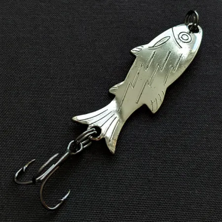 De gepolijste nikkelafwerking zorgt voor een reflecterend oppervlak met een hoog contrast op dit metalen kunstaas van 7 g (1/4 oz). Met een lengte van 4 cm (1 1/2") vertoont de Atlantic Lures Golden Wobble-Fish duidelijke ingestempelde details, waaronder een opvallend oog en gestileerde vinmarkeringen die een kleine prooivis nabootsen. Dit exemplaar van Amerikaanse makelij, gecatalogiseerd onder productcode 20479, behoudt een glanzende afwerking met een conditie van 4/5. Aan de achterzijde is de merknaam Atlantic Lures zichtbaar op de holle kant van het metalen lichaam. Het kunstaas is uitgerust met een enkele dreg en splitringen bij zowel de kop als de staart, wat het functionele ontwerp benadrukt dat bedoeld is voor het werpen of trollen.