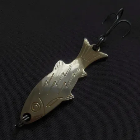 Voorzien van het “AL”-logo en "Providence R.I." op de achterzijde, biedt deze klassieke Amerikaanse lepel een mooi inkijkje in de productiegeschiedenis van Atlantic Lures. Met een lengte van 4,5 cm (1 3/4") heeft de Golden Wobble-Fish een gedetailleerd visontwerp, compleet met gestempelde schubben, vinnen en een opvallend oog. De glanzende gouden afwerking is nog steeds helder en het metalen lichaam weegt 5 g (3/16 oz), ontworpen voor zowel werpend vissen als jiggen in diverse wateromstandigheden. De montage bestaat uit robuuste splitringen en een dreg met een donkere afwerking die in uitstekende staat verkeert. Beoordeeld met een conditie van 4/5, zijn de metalen oppervlakken goed bewaard gebleven met slechts enkele lichte cosmetische spoortjes, voornamelijk aan de achterkant nabij de tekst van de fabrikant. Geproduceerd in de USA, toont dit specifieke exemplaar, herkenbaar aan productcode 22562, het scherpe stanswerk dat typisch is voor de productie van hengelsportmateriaal uit Rhode Island in het midden van de vorige eeuw.