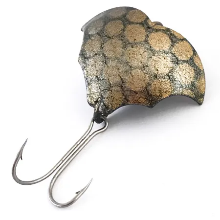 Een gewicht van 14 g geeft dit metalen kunstaas veel body, ondanks het kleine frame van 3,5 cm. De Baby Bat (productcode 5435), geproduceerd door de Prescott Spinner company in de VS, maakt gebruik van een opvallend vleermuisvleugel-silhouet dat kenmerkend is voor dit vintage ontwerp. De bovenkant is afgewerkt in een opvallend Black / Gold patroon, met grote gouden schubben gestanst over een donkere basis met textuur. De onderkant van de lepel is effen matzwart met een centrale verticale stabilisatievin die direct in het gestanste metalen lichaam is geïntegreerd. Het hang- en sluitwerk is uitzonderlijk goed bewaard gebleven, met een robuuste dubbele haak aan het achterste oogje. Dit exemplaar krijgt een conditiescore van 5/5 en vertoont zeer weinig van de slijtage die vaak wordt gezien bij dit vintage Amerikaanse werpkunstaas. Het gouden ronde schubbenpatroon blijft scherp en helder tegen de donkere achtergrond.