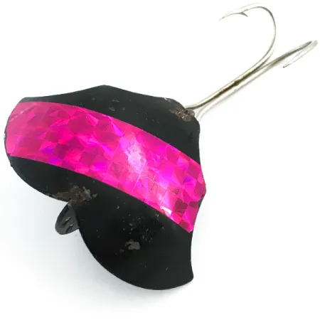 Met een gewicht van 14g (1/2 oz) heeft dit kunstaas een compact lichaam van 3,5 cm (1 1/2") dat de unieke techniek van de Prescott Spinner Company laat zien. Het zwart geëmailleerde oppervlak is voorzien van een brede, holografische magenta-roze band, wat zorgt voor een reflecterend element met hoog contrast tegen de donkere basis. Aan de binnenzijde van de vleugelachtige structuur is de naam "Baby" rechtstreeks in het metaal gestanst, wat dit model identificeert als de Baby Bat onder productcode 5456. Het beslag bestaat uit een sterke dubbele haak bevestigd aan een draadoog, een ontwerp bedoeld voor duurzaamheid met behoud van een goede inhaking. Geproduceerd in de VS, dit exemplaar verkeert in een 4/5 conditie, met goed bewaarde lak en een schone holografische applicatie, met slechts lichte leeftijdsgerelateerde sporen op de haaksteel en langs de metalen randen.
