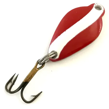 Duidelijk in de gepolijste nikkelen onderkant gestanst is de naam 'BABY COBRA', wat dit zeldzame exemplaar uit de historische catalogus van Acme identificeert. Met een klassieke rood-witte diagonale streep over de bolle zijde, vertegenwoordigt dit stuk (productcode 5414) een vervlogen tijdperk van Amerikaans metaalwerk. Met een gewicht van slechts 3 g (3/32 oz) en een lengte van 3 cm (1 1/4"), is het een typische ultralichte lepel. De vernikkeling zorgt voor een helder contrast met de gedurfde lak, en de hardware bevat een stevige splitring die naar een scherpe dreg leidt. Beoordeeld met een conditie van 5/5, blijft de afwerking levendig en goed bewaard gebleven. Vissers zoeken vaak naar deze specifieke Acme-lepels voor baars- of foreltoepassingen vanwege hun kleine profiel en duurzame constructie. Het oogje aan de bovenzijde is strak geponst, wat een eenvoudige verbinding met dunne lijnen mogelijk maakt.