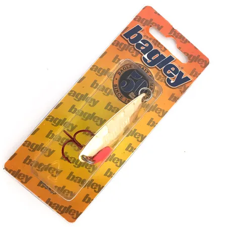 Dit verzamelbare Bagley-souvenir-lepelkunstaas glanst met een gepolijste gouden afwerking en is een prachtig stukje hengelsportgeschiedenis. Met een lengte van 5 cm (2") en een gewicht van 9 g (1/3 oz) wordt het kunstaas gepresenteerd in de originele jubileumverpakking ter ere van het 50-jarig bestaan. Het exemplaar is ongebruikt en bevindt zich nog in de originele blisterverpakking, met een conditiescore van 6. Dit specifieke model, met artikelcode 8792, is met de hand geassembleerd in de Dominicaanse Republiek met onderdelen uit de VS en is voorzien van een trailer-vin met rode punt en een stevige dreg. Op de voorkant van de kaart staat het zegel '50th Since 1954', een mijlpaal voor het merk. Deze lepel is ontworpen als een hoogwaardig herdenkingsstuk en maakt gebruik van dezelfde duurzame plating als de functionele werplepels van Bagley. De achterkant van de verpakking bevat productiegegevens van de vestiging in Fort Myers, FL, en bevestigt de productie in de Dominicaanse Republiek.