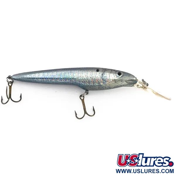 Met een lengte van 10 cm (4") en een gewicht van 14 g (1/2 oz), toont het profiel van dit dieplopende kunstaas de klassieke Bagley-afwerking uit de VS. De kleur is het opvallende Rainbow Silver, voorzien van een holografisch schubbenpatroon dat zilveren, blauwe en lichtpaarse tinten reflecteert. Deze BAGLEY Diving Bang-O, met productcode 8070, is een drijvend model ontworpen voor het werpen naar dieptes van ongeveer 3,6-4,5 m. De grote, heldere kunststof duiklip is bevestigd met een metalen bevestigingsoog, gebouwd om diepere structuren te bereiken. De originele montage bestaat uit twee dreggen met een donkere afwerking. Met een conditiescore van 5/5 behoudt het kunstaas zijn originele glans en structurele integriteit. Het ontwerp wordt voltooid door zilver omrande zwarte ogen die prominent op de zilveren kop zitten.