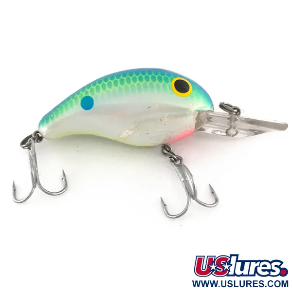 De Citrus Shad-kleur omhult het compacte lichaam van deze Bandit 200, met een blauwgroene rug met schubbenpatroon en parelmoerachtige flanken. Met een gewicht van 8,5 g en een lengte van 5 cm is dit model (productcode 7852) ontworpen om dieptes tot 3 m te bereiken. Het visuele profiel wordt geaccentueerd door een opvallende blauwe stip op de flank, een roodroze keelvlek en gele ogen met donkere pupillen. Deze in de VS gemaakte dieplopende plug bevat een interne ratelkamer voor het vissen op snoekbaars en snoek, zowel werpend als trollend. Een belangrijk technisch detail is de UV-reflecterende afwerking, die zorgt voor een betere zichtbaarheid in diepere, donkere waterlagen. De hardware bestaat uit twee originele zilveren dregshaken op een drijvend lichaam.