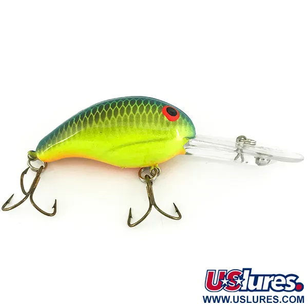 Gedetailleerde schubpatronen langs de rug gaan over in een levendig neongeel op dit Chartreuse Blue Back-patroon. Ontworpen als dieplopend gereedschap, draagt de Bandit 300 productcode 6813 en is hij ontworpen om dieptes van 2,4–3,6 m te bereiken. Deze drijvende crankbait weegt 10,5 g en heeft een compacte lengte van 5 cm, wat hem een betrouwbare keuze maakt voor zowel werpen als trollen. Het visuele profiel wordt geaccentueerd door een feloranje buik en opvallende rode ogen, wat zorgt voor een scherp contrast voor rovers zoals snoek en snoekbaars. Een grote, heldere duiklip is stevig verankerd aan het lichaam om de weerstand van diepwater-inhaalmanoeuvres aan te kunnen. Dit specifieke exemplaar verkeert in 5/5 conditie, met een schone afwerking en scherpe, bronskleurige dreggen. Een luidruchtige interne ratelkamer voegt een akoestisch element toe aan de presentatie, een kenmerkend aspect van dit klassieke Amerikaanse model.