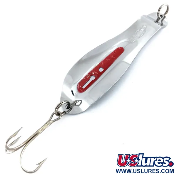 Gepolijst vernikkeld staal zorgt voor een glanzende afwerking op de 17 g (3/5 oz) metalen body van deze in de VS gemaakte lepel. Een opvallende verdiepte rode baan loopt door het midden van het blad en zorgt voor een krachtig visueel contrast tegen het reflecterende zilveren oppervlak. De Bayou Special, herkenbaar aan productcode 9847, is voorzien van een gestempeld naamplaatje bij het bevestigingsoog, een kenmerk van Amerikaanse productie uit het midden van de vorige eeuw. Met een lengte van 8,5 cm (3 1/4") bestaat de hardware uit een grote dreg die is bevestigd met een zware splitring. De oppervlakken zijn schoon en goed bewaard gebleven, wat resulteert in een conditiescore van 5/5 zonder noemenswaardig verlies van de plating. De druppelvorm is verzwaard voor verre worpen en is uitermate geschikt voor diepwaterpresentaties waarbij schittering en zichtbaarheid essentieel zijn voor de sportvisser.
