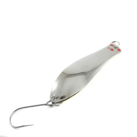 Met een gewicht van 30g (1oz) is deze Big Doctor 285 lepel een uitstekend voorbeeld van het robuuste materiaal dat Prescott Spinner in de USA produceerde. Het frame van 11cm (4 1/4") heeft een dubbelzijdige afwerking, met een gespiegelde nikkelen voorzijde en een warme goudkleurige achterzijde. Vier kleine rode stippen zijn netjes aangebracht nabij de kop van het kunstaas, wat zorgt voor een kleuraccent op het gepolijste metaal. Gecatalogiseerd onder productcode 1177, verkeert het kunstaas in conditie 5/5, waarbij zowel de plating als de enkele dreg achteraan geen gebruikssporen vertonen. De constructie vertrouwt op sterke splitringen om het beslag te verbinden met het gestanste metalen lichaam, een kenmerk van kunstaas bedoeld voor zowel werpen als trollen.