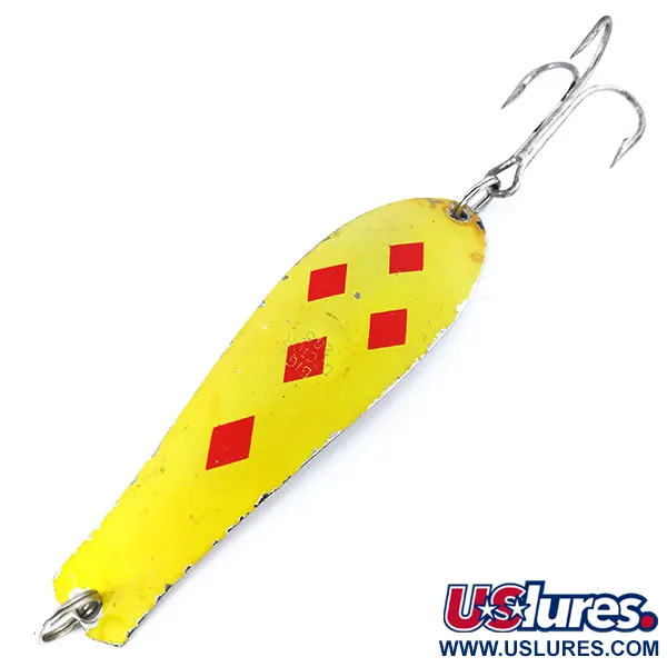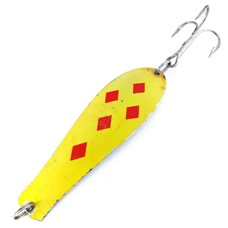 Vijf rode ruiten contrasteren scherp met de heldergele basis van deze klassieke Amerikaanse lepel. Met een gewicht van 28g (1oz) en een lengte van 11cm (4 1/4") blijft de Prescott Spinner Big Doctor 285 UV een substantiële keuze voor sportvissers die op grote roofvissen jagen met werpend vissen of trollen. Dit exemplaar, met productcode 10718, heeft een conditiescore van 4/5 en vertoont lichte ouderdomssporen, terwijl de levendige, goed zichtbare afwerking behouden is gebleven. Het meest opvallende technische aspect is de fluorescerende eigenschap van de gele verf; onder ultraviolet licht straalt het lichaam van het kunstaas een sterke groene gloed uit, waardoor de rode ruiten als donkere, contrastrijke silhouetten verschijnen. Een subtiel detail is te vinden in de centrale ruit, waar de naam "Big Doctor" rechtstreeks in het metaal is gestanst. Het kunstaas is afgewerkt met een heavy-duty dreg en originele splitringen, klaar voor de verzameling of om weer het water in te gaan.