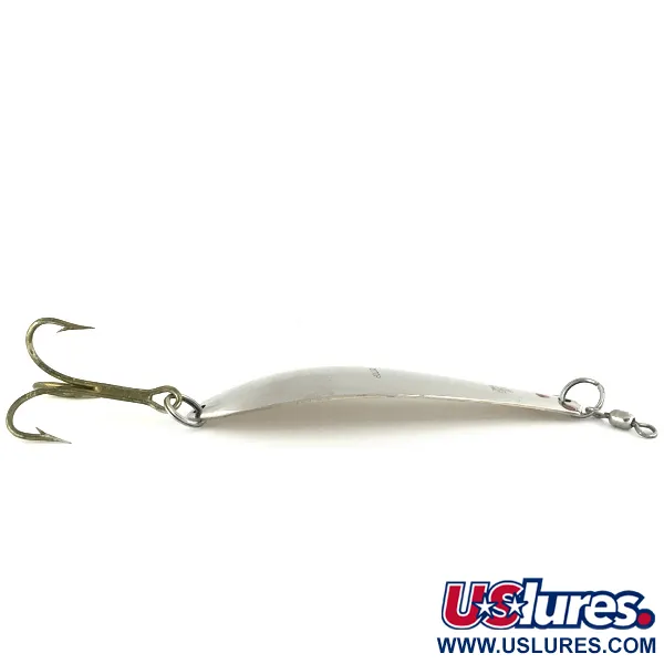 Met een aanzienlijk gewicht van 30g (1oz) is deze lepel direct herkenbaar als geschikt voor het bereiken van roofvissen in diep water. Met een lengte van 11cm (4 1/4") heeft het profiel een tweekleurige esthetiek met een gepolijste zilveren voorzijde en een rijke goudkleurige achterzijde. Kleine rode accenten bij het bovenste oog zorgen voor een lokale kleurflits tegen de glanzende metalen body. Op de zilveren kant staat duidelijk het "DOCTOR"-kenmerk, wat dit model identificeert onder productcode 7110. Deze in de USA gemaakte lepel is uitgerust met een heavy-duty dreg en een soepel draaiende wartel, bevestigd via versterkte splitringen. Het exemplaar verkeert in 5/5 conditie, waarbij zowel de gouden als zilveren oppervlakken hun originele hoogglansafwerking hebben behouden. Het dikke metaal is gebouwd voor zware worpen of trollen op grote zoetwaterroofvissen.