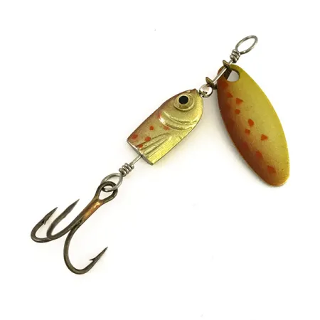 Gemerkt met de oorsprongsaanduiding "Finland" op de achterzijde van het zilveren blad, vertegenwoordigt deze spinner een klassiek tijdperk van Europese kunstaasfabricage. Dit exemplaar van 5 cm, vermeld onder productcode 7889, heeft een gespecialiseerde viskop-body verzwaard op 4 g. Het beekforel-kleurenpatroon is zorgvuldig aangebracht op het loodlichaam en de voorzijde van het ovale blad, bestaande uit een warme gouden basis geaccentueerd door feloranje stippen en een donker, gedefinieerd oog. Een scherpe dreg is bevestigd aan de doorlopende draadas, die is afgewerkt met strakke wikkelingen en kleine metalen afstandhouders. De conditie is gewaardeerd als 5/5, met goed bewaarde verf op het elrits-profiel en een schoon, reflecterend oppervlak op de metalen onderdelen.