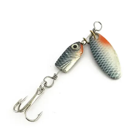 Lichtblauwe schubpatronen sieren zowel het blad als het lichaam van deze 4 g (1/8 oz) spinner, wat het klassieke Finse ontwerp benadrukt. De Blue Fox Flash Deep Runner, met productcode 8967, heeft een profiel van 5 cm (2") gebouwd rond een verzwaard lichaam in de vorm van een kleine aasvis. Dit lichaam is voorzien van een realistisch geschilderd oog en een oranje getinte kop die past bij het accent aan de bovenkant van het wilgenblad-vormige spinnerblad. Terwijl de voorkant van het blad het ingewikkelde blauwe en zilveren schubmotief vertoont, is de achterkant afgewerkt in glad gepolijst zilver. Een messingkleurige beugel laat het blad vrij draaien om het zilveren draadframe, dat via een splitring verbonden is met een enkele dreg. De conditie is beoordeeld als 5/5, aangezien het exemplaar uitzonderlijk schoon is met levendige verf en glanzende metalen onderdelen. Fijne kruisarcering op de metalen oppervlakken voegt een visuele gelaagdheid toe aan het kunstaas.