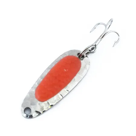 Gehamerd nikkel zorgt voor een hoogglanzend oppervlak op deze compacte 3,5 cm (1 1/2") zware messing lepel. Met een gewicht van 4,5 g (3/16 oz) heeft de Blue Fox Pixee UV een klassiek druppelprofiel dat goed standhoudt in sterke rivierstromingen of diepe gaten in meren. Het kenmerkende aspect van dit model (code 11006) is de centrale rode insert die een zalm-eitje nabootst. Dit fluorescerende element reageert op UV-licht en biedt een lichtgevend mikpunt in troebel water. Blue Fox heeft deze lepel ontworpen met genoeg gewicht voor verre worpen, zelfs bij kustwind. Het exemplaar verkeert in uitstekende staat met een heldere afwerking en intacte hardware (score 5/5). Een scherpe dreg is bevestigd aan de achterste splitring, klaar voor forel, zalm of baars.