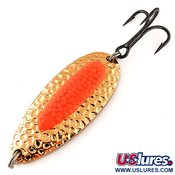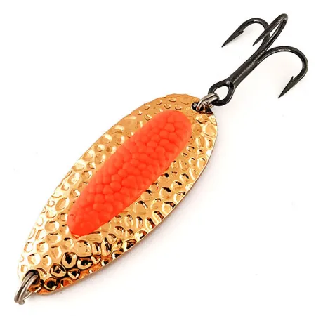 Een zware messing constructie van 24 g (3/4 oz) kenmerkt deze Blue Fox Pixee UV lepel, ontworpen voor de verre worpen die nodig zijn in rivier- en kustwateren. Met een lengte van 6,5 cm (2 1/2") zorgt de gehamerde Gold / Pink afwerking voor een multidirectionele schittering. Een centraal kenmerk van dit model is het gesimuleerde zalmeitje; terwijl het in natuurlijk licht levendig oranje-roze oogt, vertoont het een duidelijke gloed onder UV-licht om te helpen bij slecht zicht. Dit specifieke exemplaar, met productcode 12187, is gebouwd met een dikwandig lichaam waardoor het door diepe gaten kan tuimelen en rollen zonder te snel naar de oppervlakte te stijgen tijdens het binnenvissen. De hardware omvat een donker afgewerkte dreg en stevige splitringen, typerend voor de Amerikaanse productie. In 5/5 conditie blijven de metaalafwerking en het speciale inzetstuk glanzend en intact, waardoor het een betrouwbare keuze is voor het vissen op steelhead, zalm of snoek.